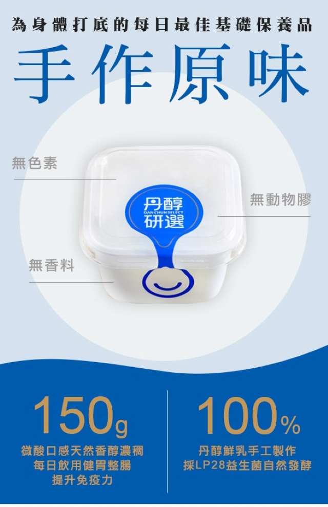 每盒淨重150g 100%丹醇鮮乳手工製作 採LP28益生菌自然發酵 無添加色素、香料、動物膠 微酸口感天然香醇濃稠 每日飲用健胃整腸提升免疫力 請冷藏保存於 7ºC以下,可保存10日,並請在保存期限前飲用 長時間靜置會出現乳水分離,屬自然現象,請安心食用 。